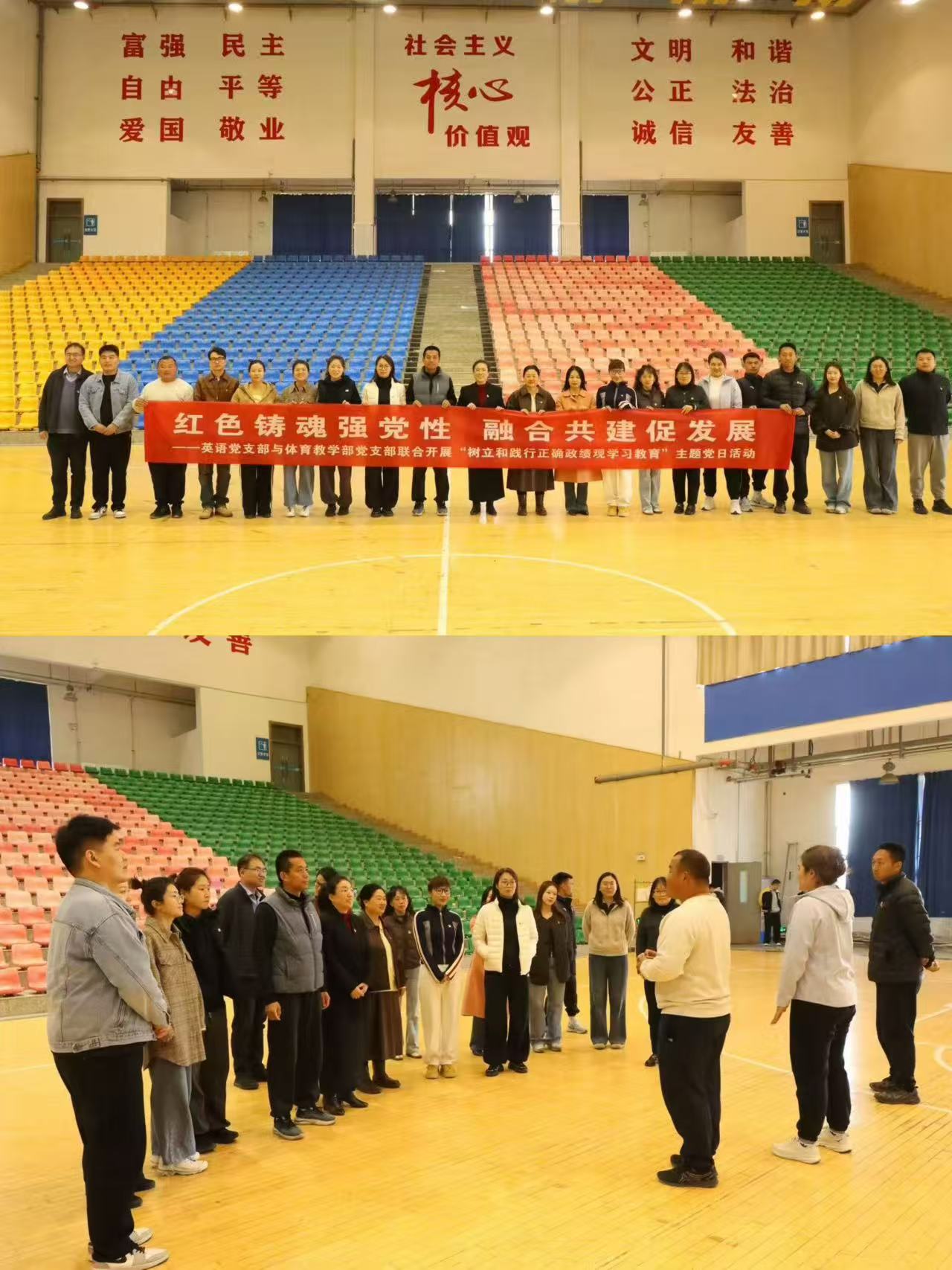 为深入学习贯彻习近平新时代中国特色社会主义思想,树牢党员教师正确政绩观,推动党建与教育教学深度融合,3月25日下午3点,英语党支部与体育教学部党支部联合开展红色铸魂强党性 融合共建促发展——英语党支部与体育教学部党支部联合开展“树立和践行正确政绩观学习教育”主题党日活动,两个支部全体党员参加活动。